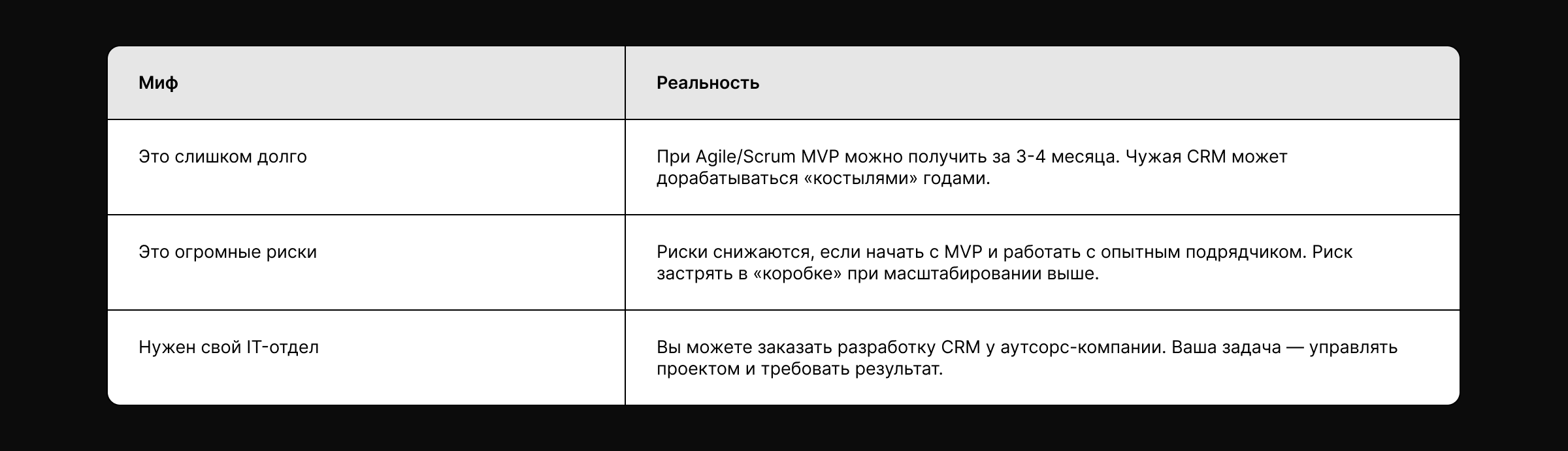 - Внешний подрядчик — это быстрый старт MVP и доступ к широкой экспертизе. Имеет фиксированный бюджет и сроки. Оптимален для запуска CRM без своего штата разработчиков.
